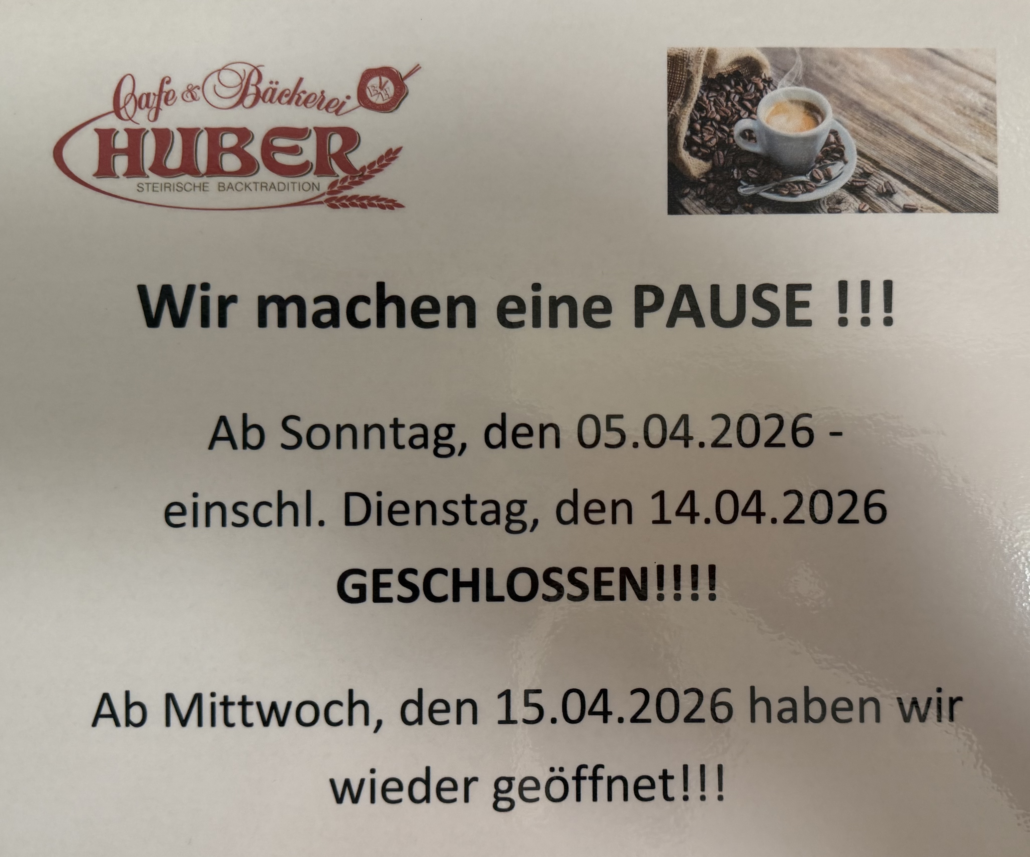 Die Bäckerei Huber hat von Sonntag 05.04.2026 bis einschließlich Dienstag 14.04.2026 geschlossen.