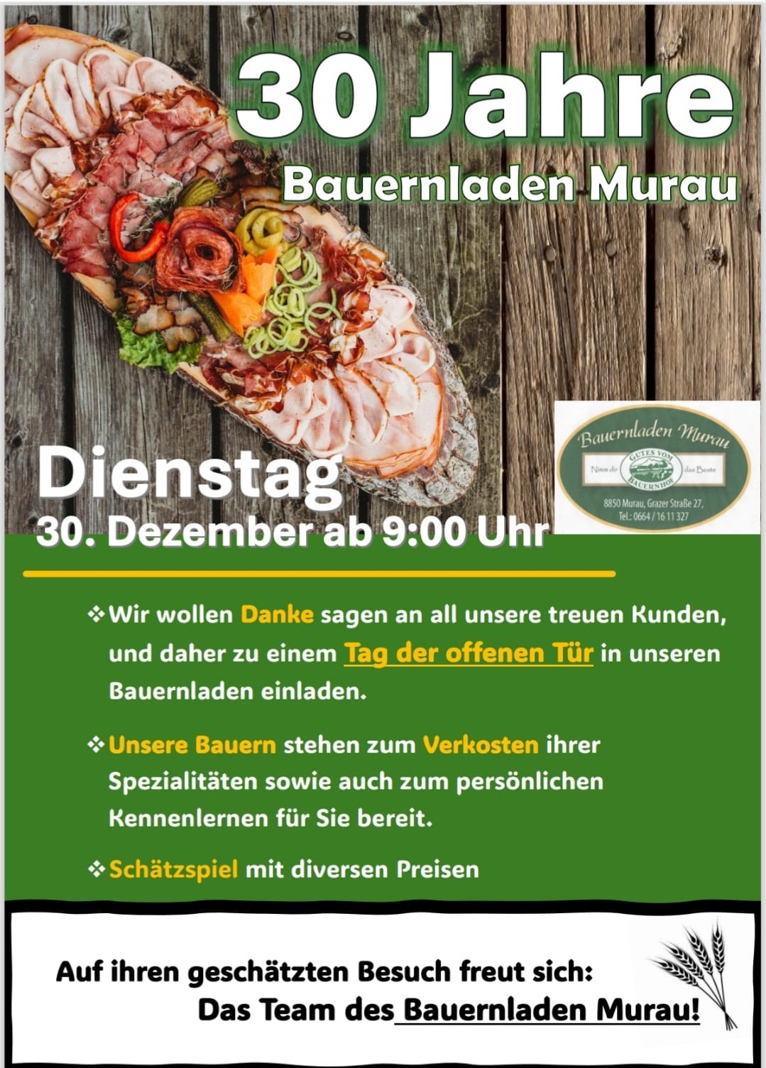 Das Team des Bauernladen Murau lädt am 30.12.2025 ab 9:00 Uhr zum Tage der offenen Tür in den Bauernladen Murau ein.